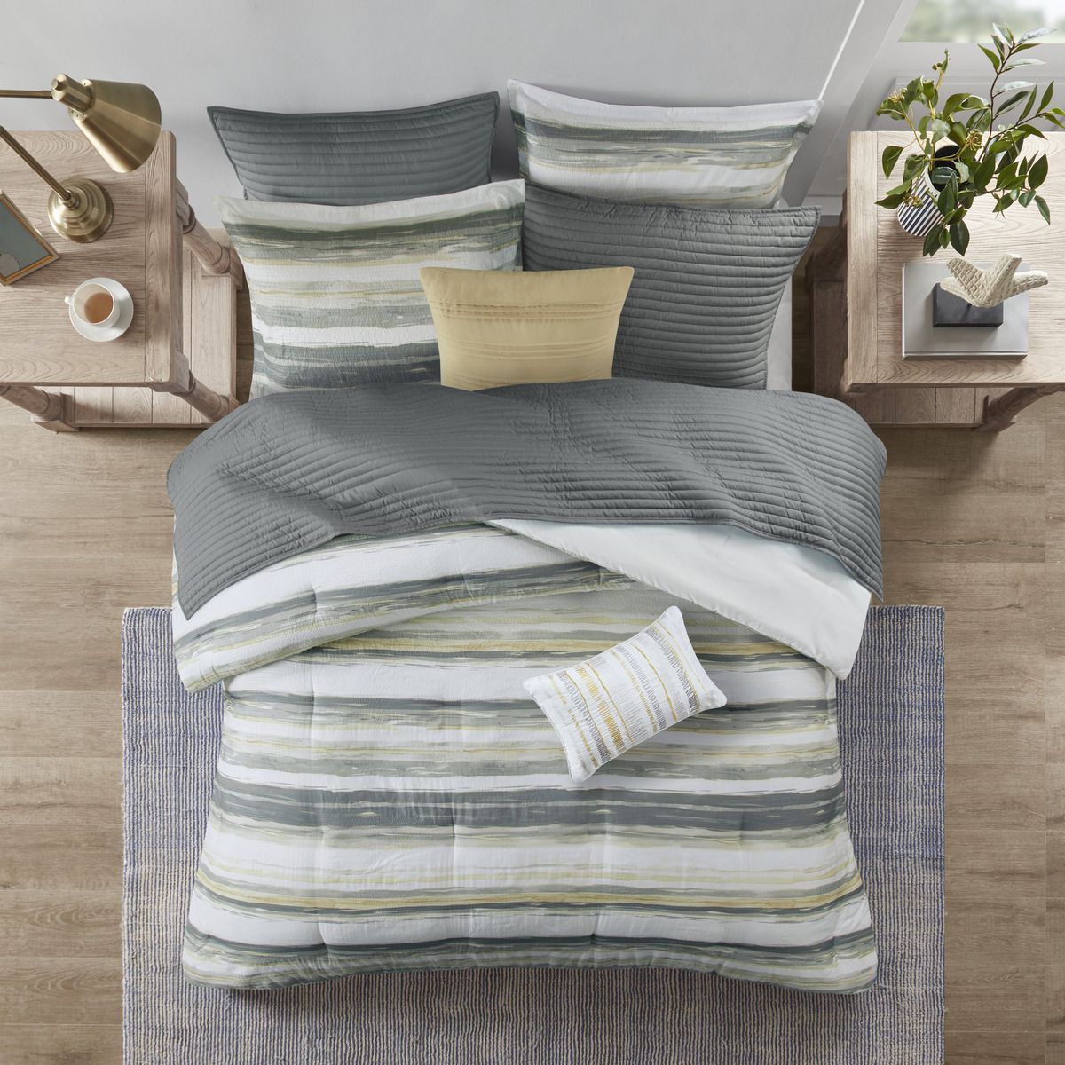 Textured seersucker comforter features watercolor stripe in muted yellow and gray hues and an off white reverse