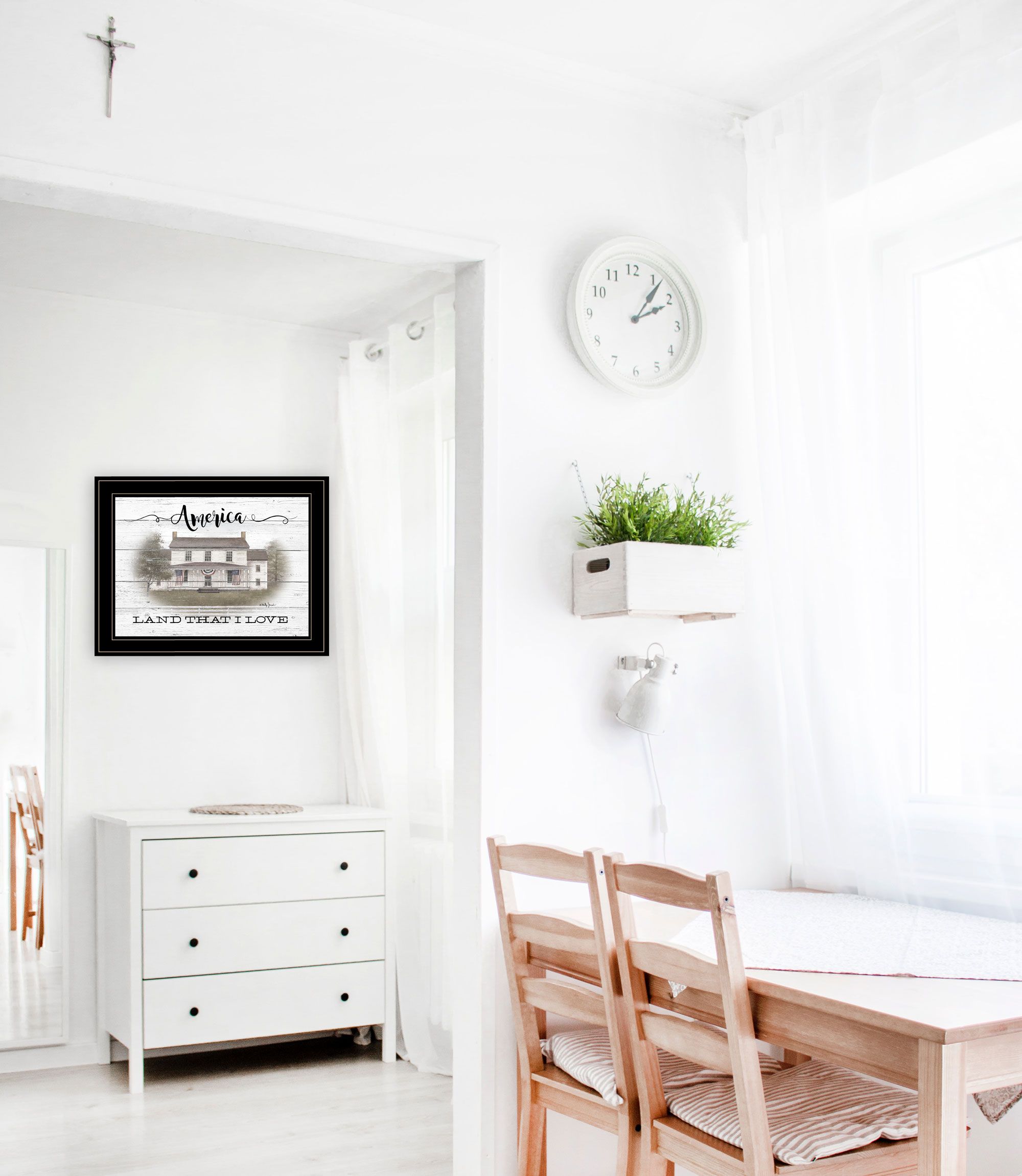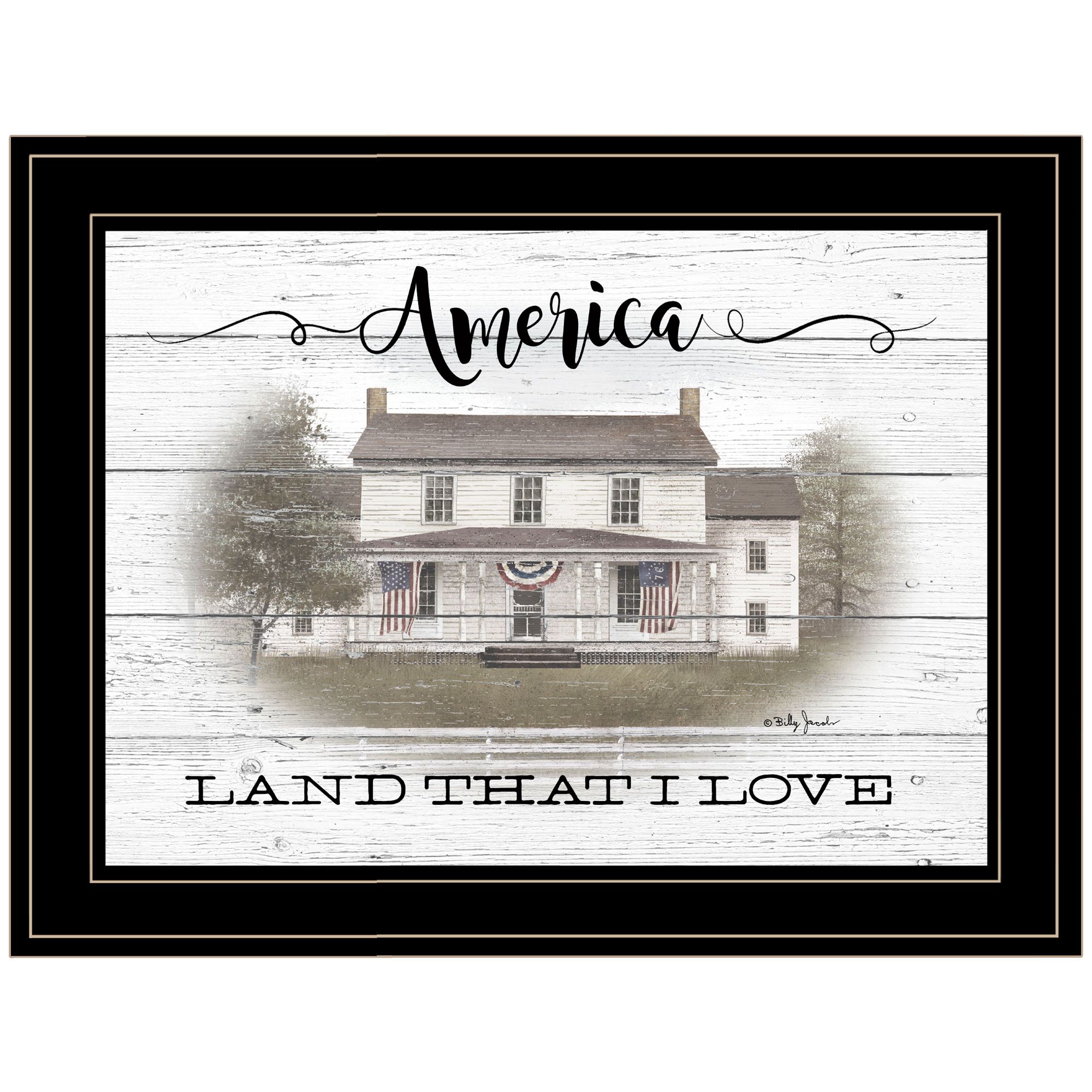 BJ1203-704G "America" by artisan Billy Jacobs, in a decorative grooved (19x15) black frame. This art features a farm homestead and a barn in the background of the print placed on a shiplap background. Script says: America Land that I Love." This artwork is drawn by the famous Ohio artisan Billy Jacobs. The surface of the print is textured with a fade resistant coating so no glass is necessary. Arrives ready to hang. Made in the USA by skilled American workers. •Textured Artwork with a 'rolled on' acid free acrylic coating to create a canvas painting effect. No glass is necessary.•Surface of the print has a fade resistant coating.•Arrives Ready to Hang•Woman Owned Business (WBE)•Handmade in the USA•Decorative Moulding adds natural beauty to the framed art.