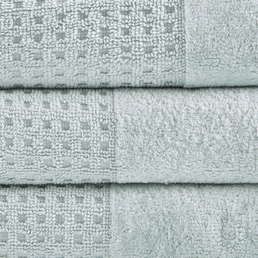 Our Madison Park Spa Waffle Cotton Towel 6 Piece Set provides the perfect textured update to your bathroom decor. This 100% cotton towel set features an all-over waffle combed jacquard design for a rich texture, while the velour dobby cuff adds a stylish contrast touch for an updated look and feel. The 600gsm weight makes each towel soft yet also lightweight and quick-drying, so it does not get weighed down from moisture throughout the day. These towels are also finished with a SILVADUR™ antimicrobial treatment providing built in freshness protection, inhibiting growth of odor causing bacteria, and keeping linen newer, longer. Active for multiple washes, this treatment delivers long-lasting durable odor protection performance. In addition, this towel set is also Made in Green by OEKO-TEX certified, meaning they do not include any harmful substances or chemicals while also using sustainable processes and socially responsible working conditions, for the best in quality comfort and wellness. Complete the look with coordinating Spa Rug and Spa Waffle Shower Curtains, available and sold separately. Set includes: 2 standard 28x54" bath towels, 2 standard 16x26" hand towels, and 2 standard 12x12" wash towels.