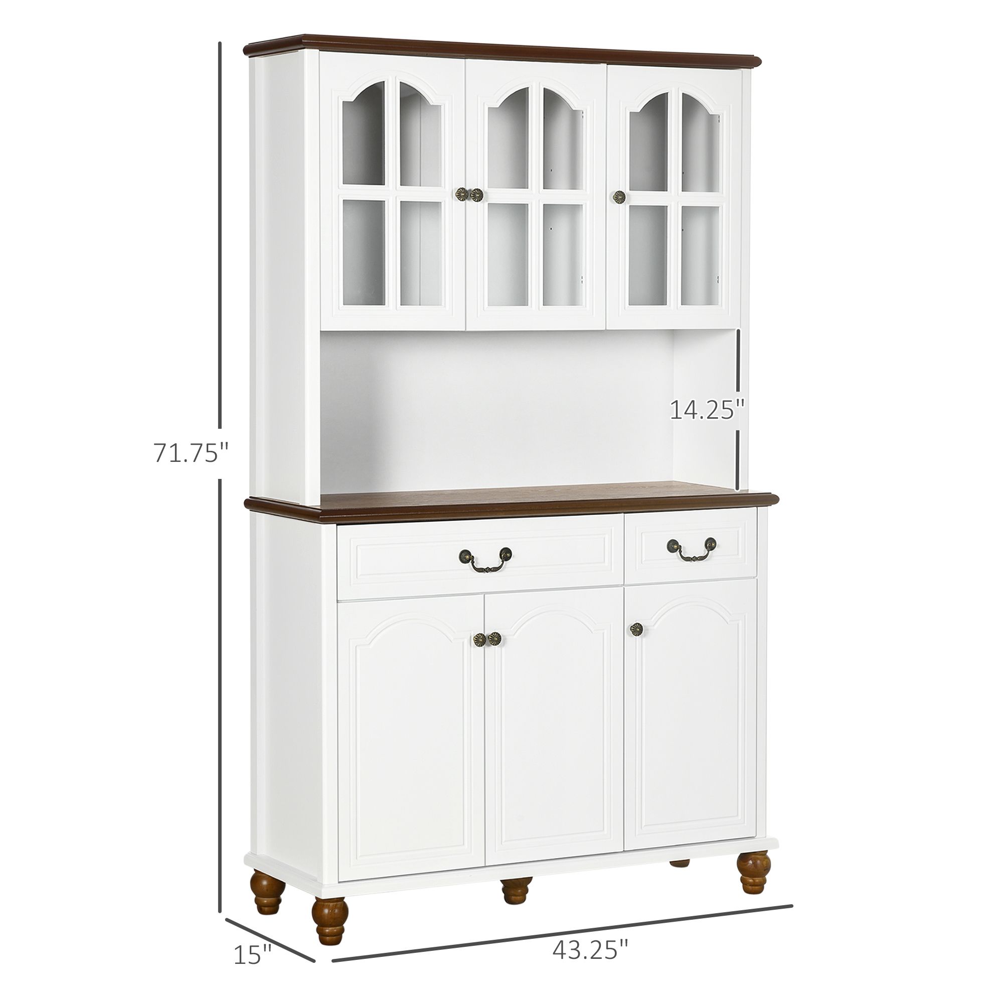 This HOMCOM hutch cabinet with glass doors, arched sectional windows, antique legs, dark wood, and vintage handles can help bring beauty to your space. No more overflowing objects and mess that create obstacles when you need to access the back of a cabinet; this tall, wide cupboard will give you the space to know where everything is and get to it quickly.