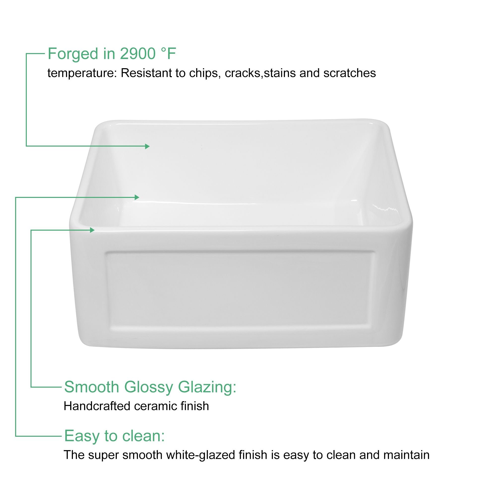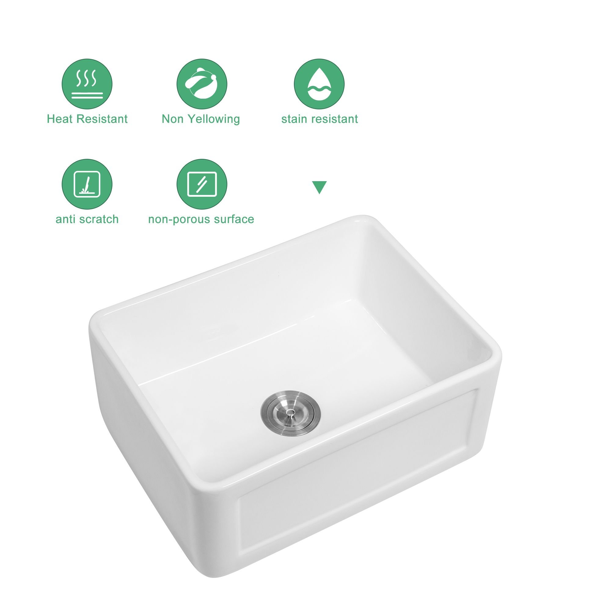 2.The single bowl farm sink after more than 1200°C high temperature calcination, the water absorption rate of the product is less than 0.2%, reaching the standard of vitrified porcelain.