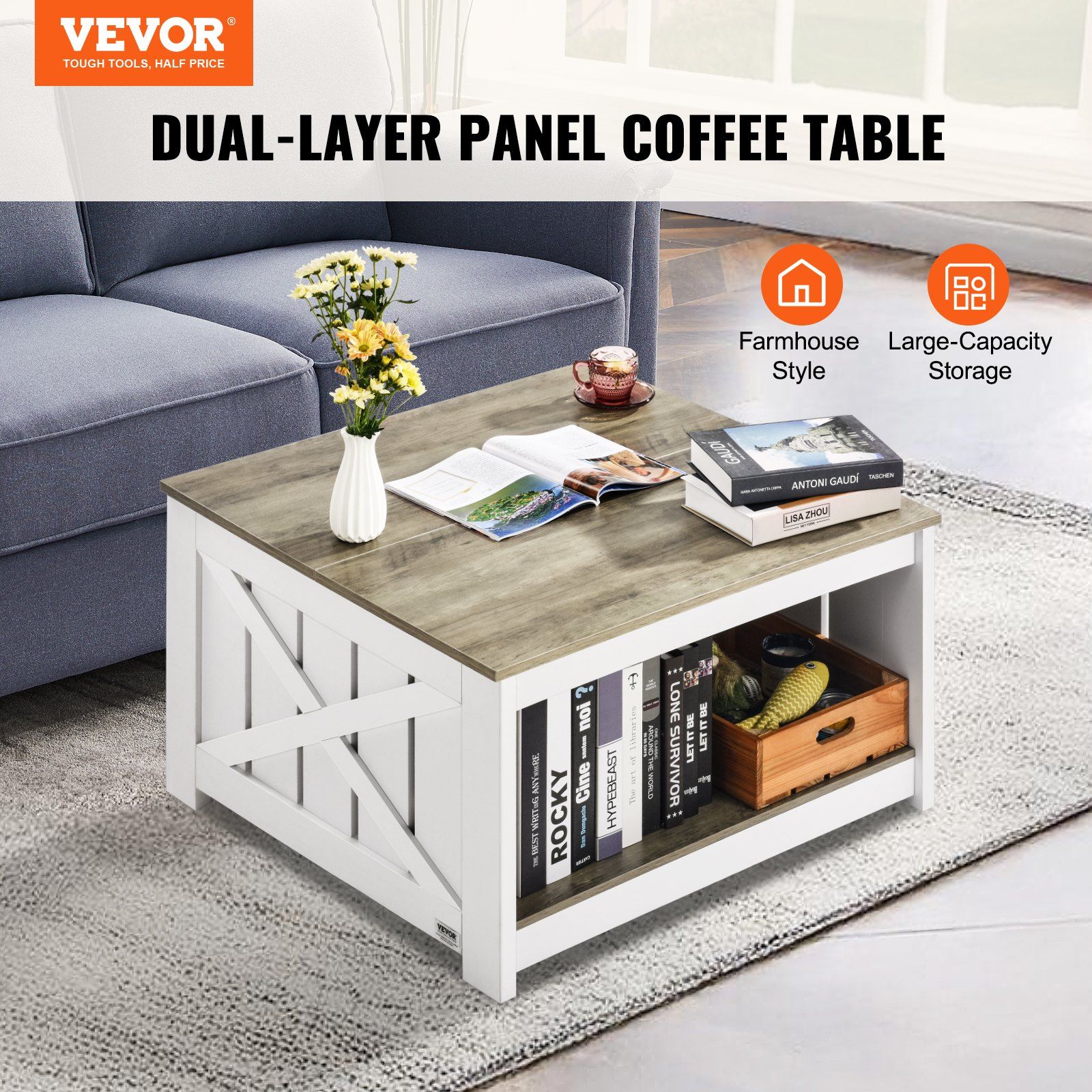 Blending stylish and practical elements, this farmhouse coffee table incorporates vintage aesthetics and wooden materials, creating a natural, cozy, and relaxing atmosphere.